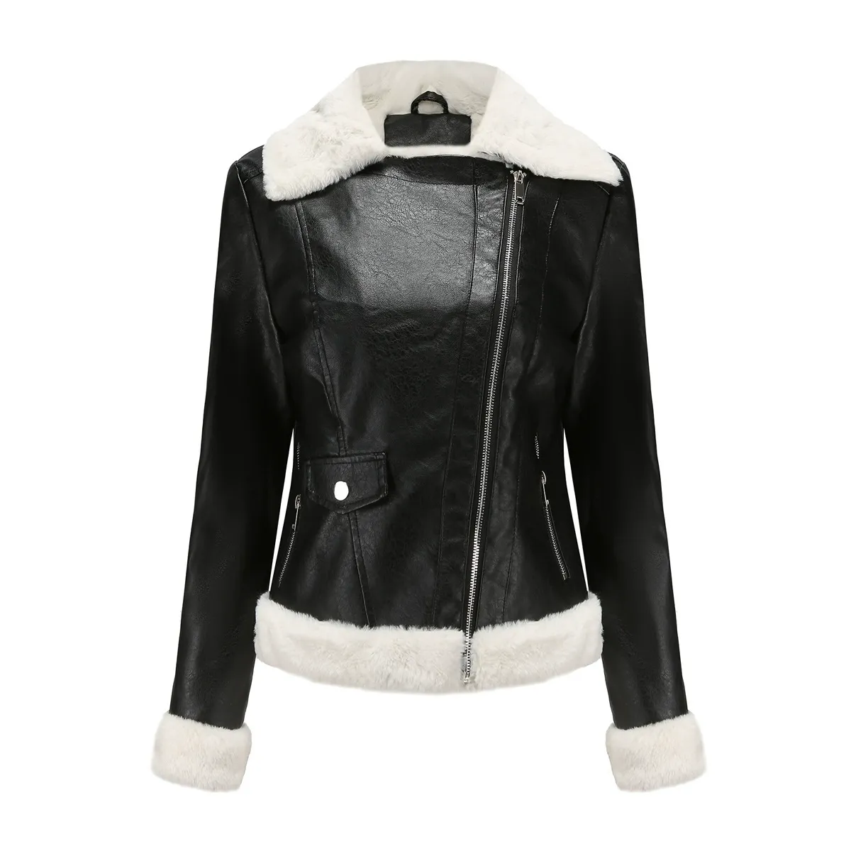 Faux Fur Trim Structured Faux Leather Jacket. Elevate your style with this women's faux leather jacket featuring a structured fit, asymmetrical zip, and plush faux fur trim. It's the perfect blend of edgy and elegant.